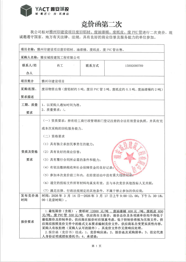 雅州印建設(shè)項(xiàng)目廢舊鋁材、油漆桶、廢紙皮、廢PVC管出售(第二次)